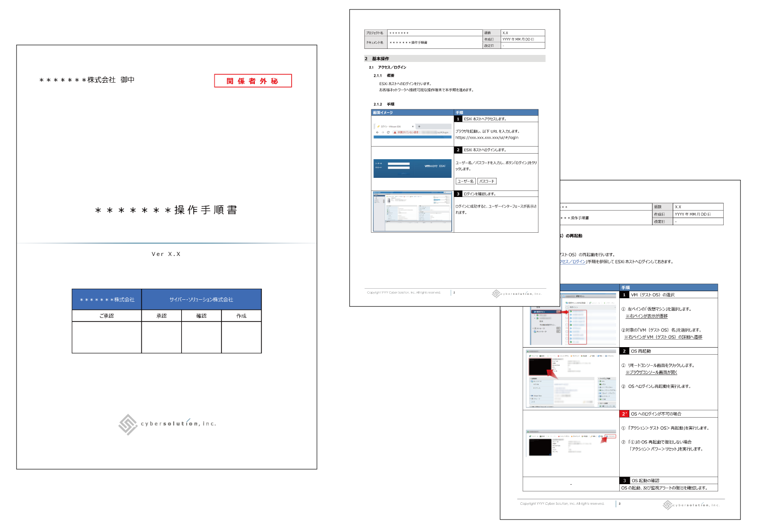 | 運用手順書 | 実際に障害発生時や運用代行作業時に使用する手順書です。対応フローと対応手順があります。 |