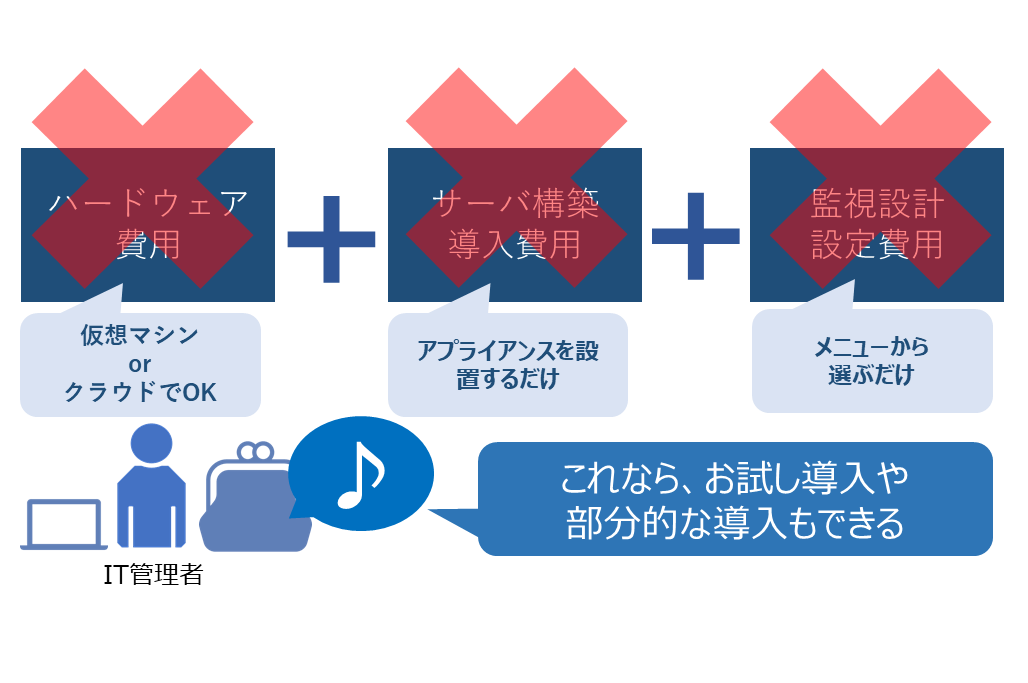 また、監視に必要なシステムの構築・導入・設計も必要ありません。クラウドサービスとして提供することで初期費用はほとんどかかりません。