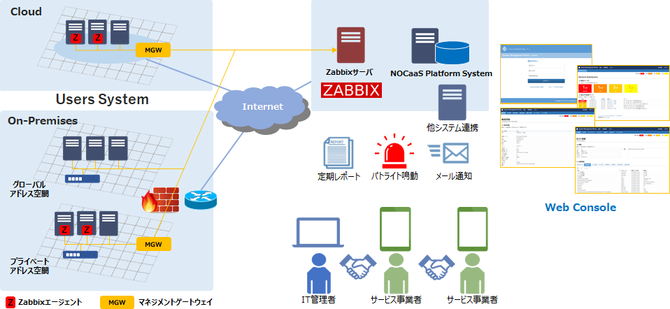 NOCaaS with Zabbixは、統合運用監視システムであるZabbixをシステム監視基盤として採用し、Zabbixの柔軟かつ高度な監視機能と、運用管理に必要な情報管理機能を連携させた、システム運用オペレーションのための運用監視クラウドサービスです。
